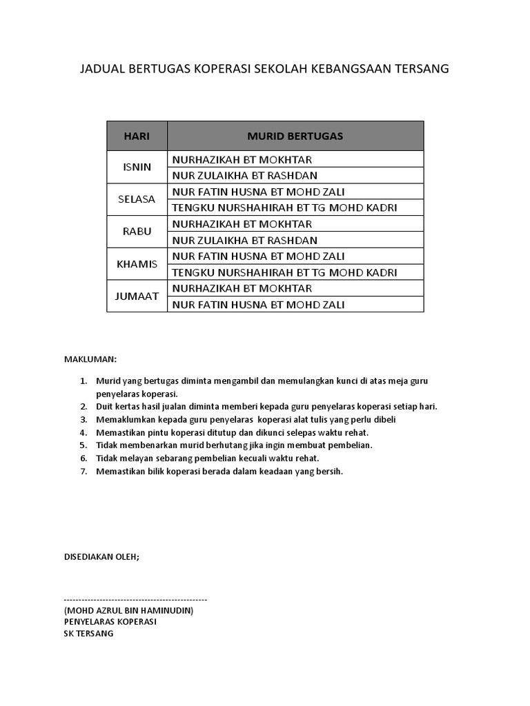 Jadual Bertugas Koperasi Sekolah Tersang Pdf